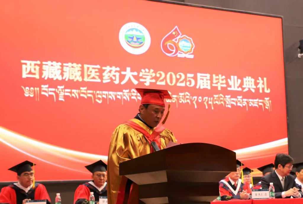 米玛强调,身处新时代的广大毕业生,仍需要重塑学习的意义和方法,在日新月异的变革中把握好未来之“路”。希望同学们一要筑牢信仰之基,厚植家国情怀。把家国作为奋斗、奉献的基础,把个人理想融入国家和民族的伟大梦想之中,在时代的浪潮中锚定方向,将理想信念熔铸于青春热血,把爱国情怀镌刻在藏医药传承创新的奋进道路上。二要跟随先贤足迹,走好传承之路。在浩瀚的藏医药典籍中寻根溯源,从藏医药理论与实践中汲取智慧与力量,将个人前途与藏医药发展紧密融合,为人民群众的生命健康保驾护航,以一颗敬畏之心,精心守护这份文明的根脉。三要紧跟时代步伐,驰骋创新之路。秉承先贤“敢为人先”的探索精神,敏锐洞察领域前沿,勇于跨越学科界限,在临床实践与科学研究中不断提出新见解、尝试新路径、贡献新智慧,在问题的深度求解和不断创新中推动藏医药行业发展、实现自我价值。