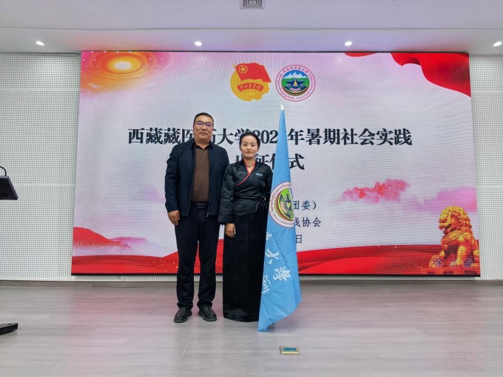 会上,藏医系23级护理班达瓦曲珍同学作为暑期社会实践学生代表发言;多杰仁青为本次社会实践团代表授旗。