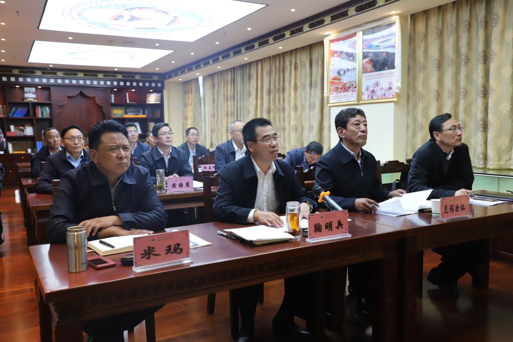 北京中医药大学副校长刘铜华,哈尔滨医科大学党委副书记兼工会主席贺景平,江西中医药大学党委委员、副校长简晖,中国药科大学党委书记金能明,江南大学党委副书记戴月波,我校党委书记鞠明兵,校长尼玛次仁,副校长米玛、吴正国,纪委书记黄国慧及校长助理白俊杰出席,六所高校相关职能部门主要负责人等共47人参加视频会。